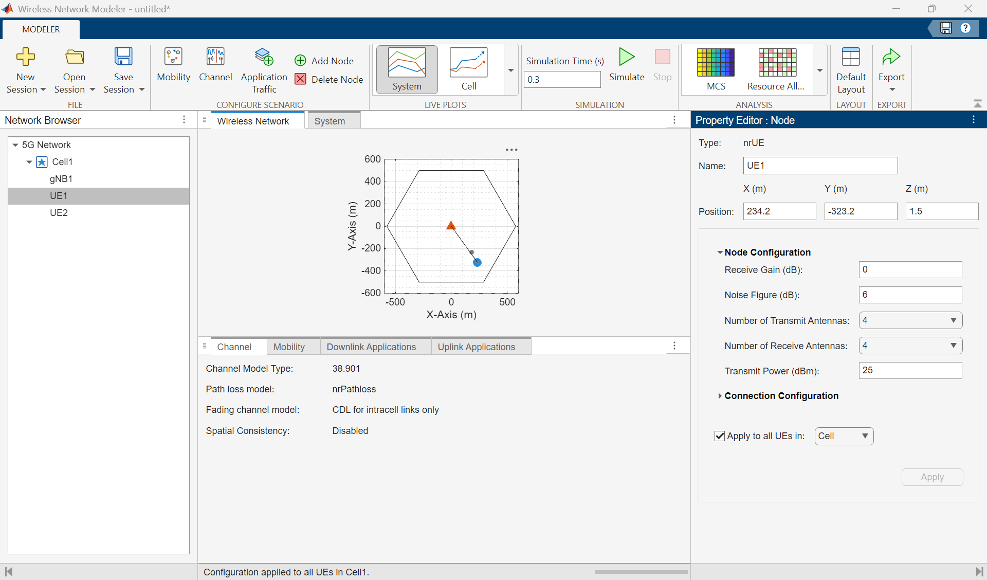 4. In the Network Browser pane, select UE1. In the Property Editor: Node pane for UE1, in the Node Configuration section, set Number of Transmit Antennas to 4, Number of Receive Antennas to 4, and Transmit Power to 25.