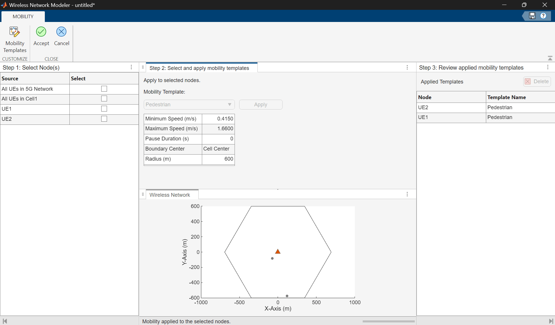 Add a mobility model to the UE nodes by following these steps.