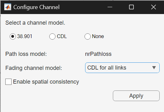 2. In the Configure Channel dialog box, set Select a Channel Model to 38.901. Set Fading channel model to CDL for all links.