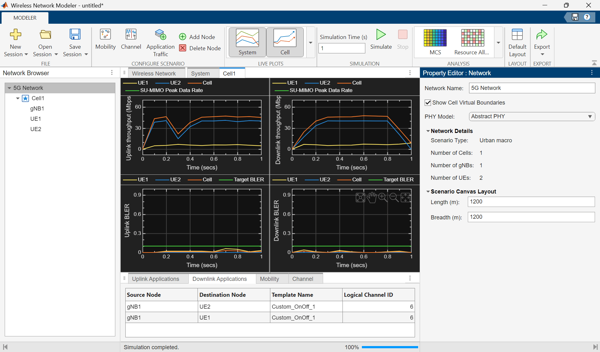 To analyze the cell-level performance (uplink throughput, downlink throughput, uplink block error rate (BLER), and downlink BLER), go to the app toolstrip. In the Live Plots section, select Cell. Then, in the Simulation section, click Simulate. You can monitor progress using the status bar at the bottom of the window.