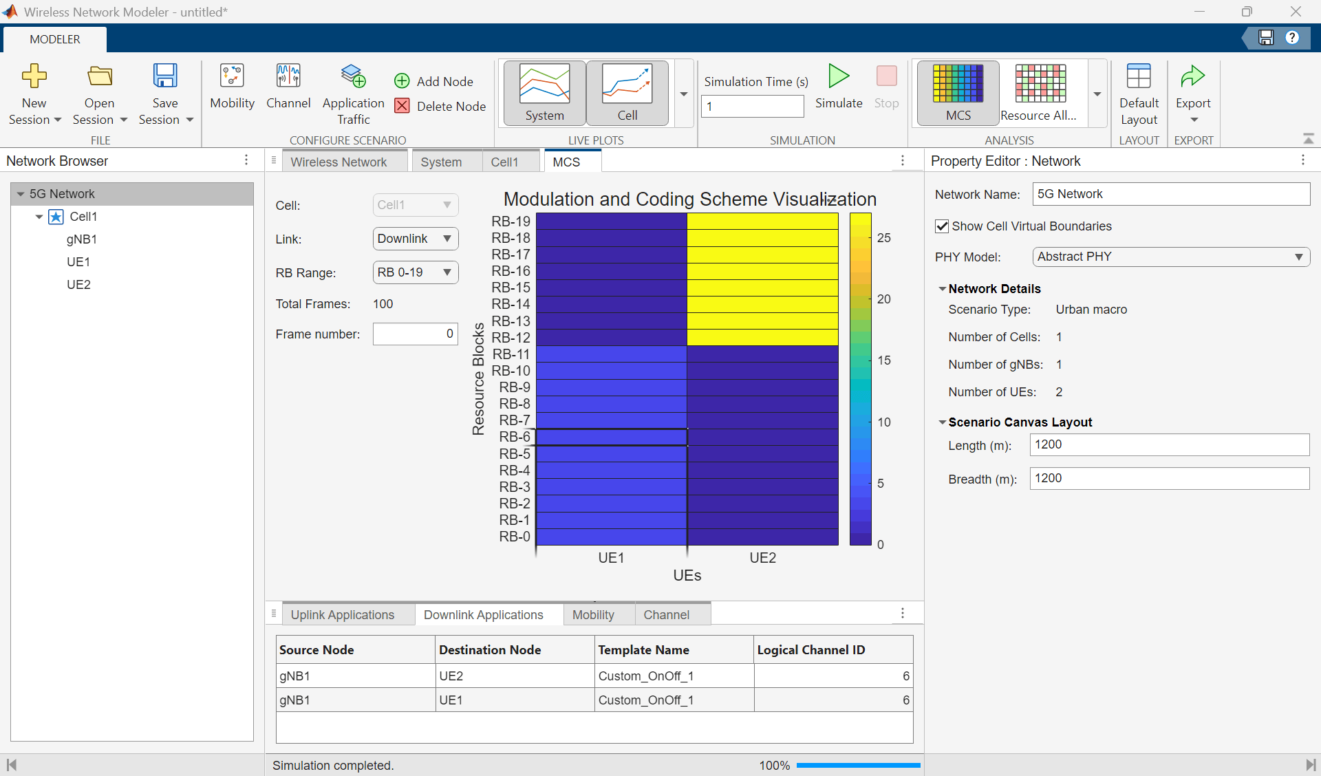 You can also visualize the modulation and coding scheme (MCS) for UE nodes and the resource allocation by selecting MCS and Resource Allocation in the Analysis section, respectively.