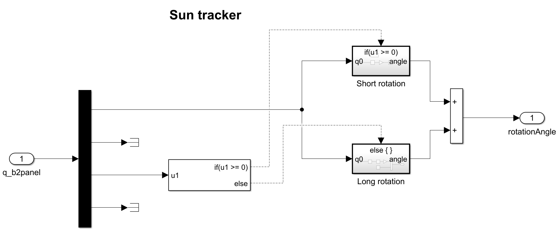 The Sun tracker subsystem calculates the attitude of the panels to align their z-axis with the Sun and outputs the rotation angle about the y-axis to achieve the desired attitude.