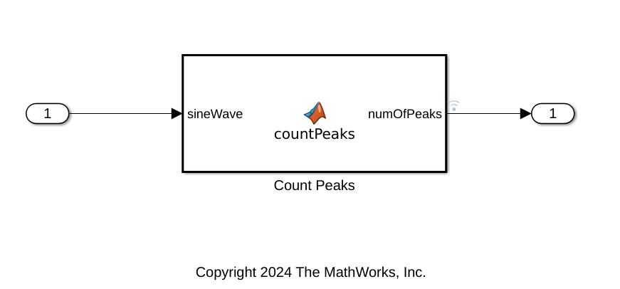 Open the UsingPilBlock model. The model contains a Sine Wave block that passes a sine wave to two MATLAB Function blocks that count the number of peaks from the incoming signal.