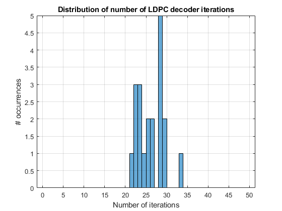 distFig = figure; histogram(numIterVec,1:dvb.LDPCNumIterations-1); xlabel('Number of iterations'); ylabel('# occurrences'); grid on; title('Distribution of number of LDPC decoder iterations')