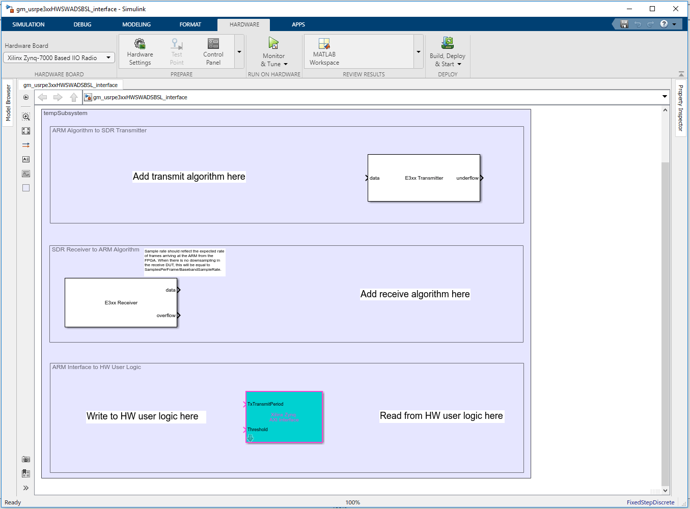 The software interface model can be used as a starting point for full SW targeting to the Zynq: External mode simulation, Processor-in-the-loop and full deployment. Note that this generated model will be overwritten each time Step 4.2 is run, so it is advisable to save this model under a unique name and develop your software algorithm in there. A software interface model has been provided which shows how you may decide to structure this model, see section Running the Software and Hardware on the USRP Embedded Series radio hardware.
