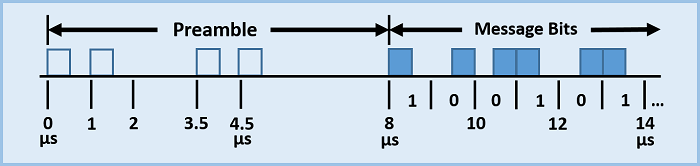 For PPM, a Logic 1 is obtained when the signal is ON for the first half of a bit interval and OFF for the second half. Likewise, a Logic 0 is obtained when the signal is OFF for the first half of a bit interval, and ON for the second half. As PPM Modulation is extremely time sensitive, it is important that a Mode S receiver is able to use the preamble to determine the exact sample where the message bits start.