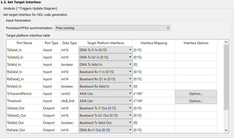 A software interface model has been provided that shows how you could modify the generated model to set it up for the ADS-B Mode S example. This interface model will allow you to run the model in Monitor & Tune mode or fully deployed.