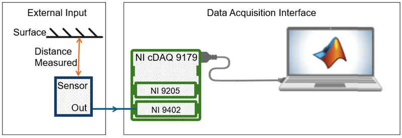 This example shows how to measure the width of an active high pulse. A sensor is used to measure distance from a surface. The width of the pulse is correlated with the measured distance.