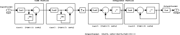FullPrecision— In this mode, the word and fraction lengths of the filter sections and outputs are automatically selected for you. The output and last section word lengths are set to:where R is the interpolation factor, M is the differential delay, N is the number of filter sections, and I denotes the input word length.