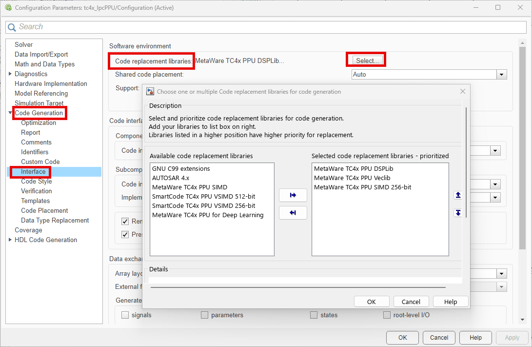 4. Expand Code Generation and select Interface. Under Software environment, click Select to view and sepcify the code replacement libraries (CRL). For more information on these libraries, see Parallel Processing Unit for Optimized Code Generation.