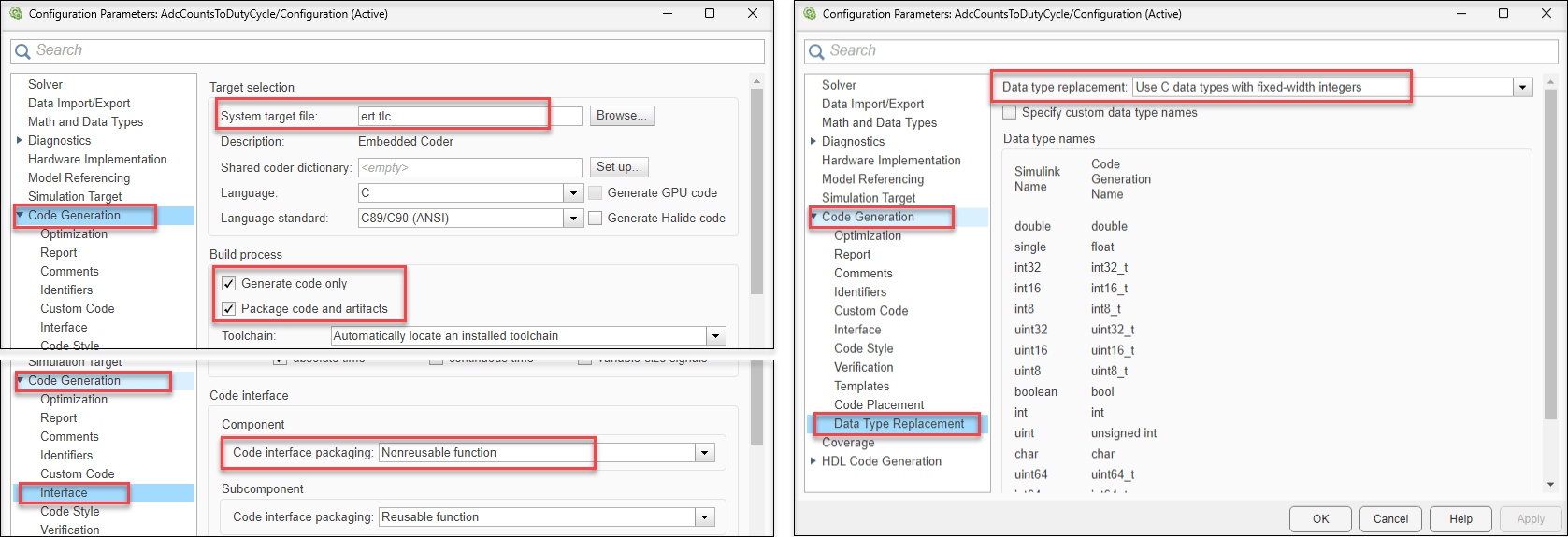 Configure the Simulink model to generate code based on the hardware application requirements. Use these settings to generate maintainable code that you can deploy to any microcontroller: