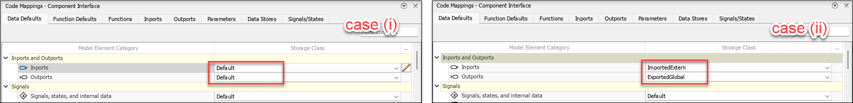 2. In case (i), all model elements use the default storage class. For applications that require data import or export from the model, set the Inports and Outports options to the ImportedExtern and ExportedGlobal storage class, respectively.