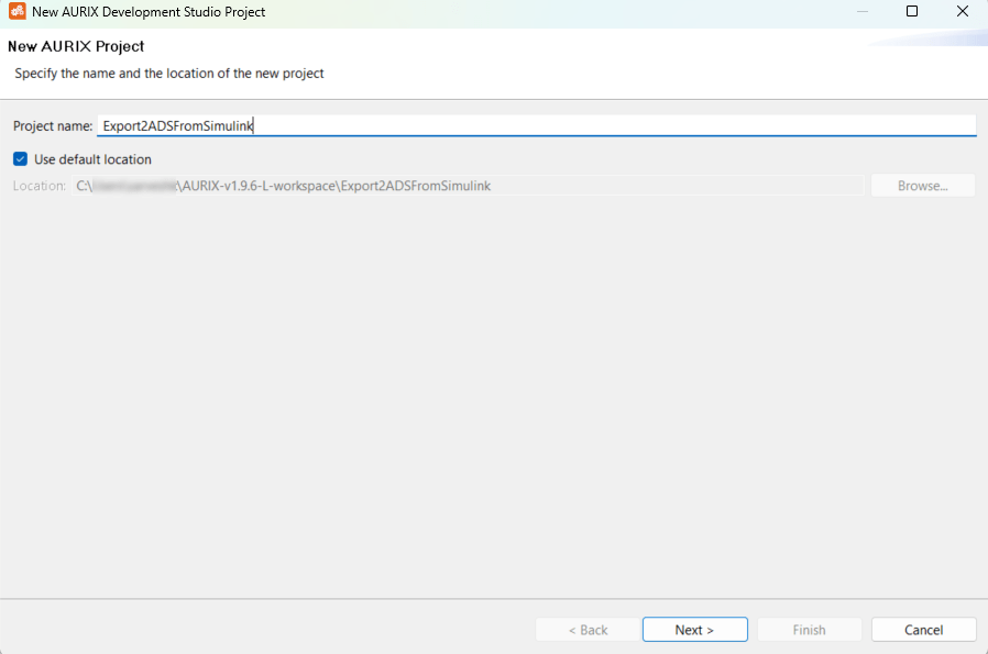 2. In the new project window, specify a project name, choose a project location and click Next. This example uses a project named Export2ADSFromSimulink.