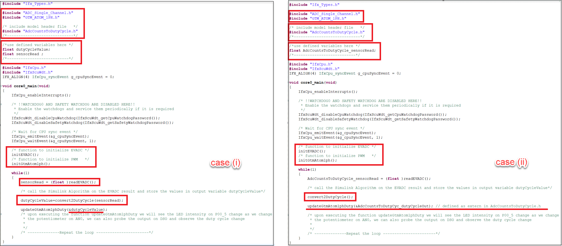 These images show snippets of code from the updated Cpu0_Main.c file for two two code generation scenarios.