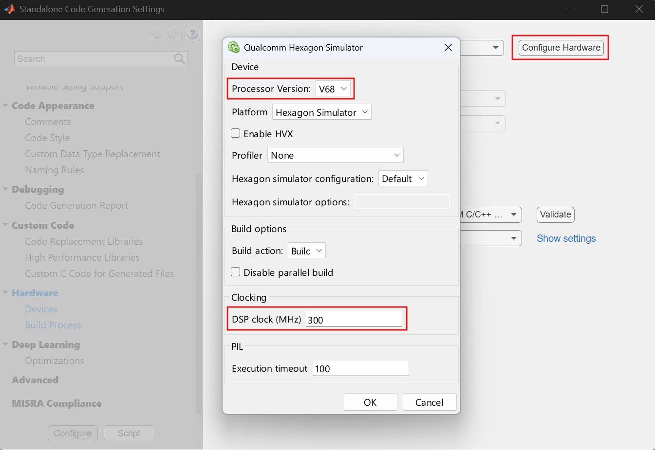 Set hardware configuration settings by clicking on the Hardware > Device > Configure Hardware button. Set the Processor Version to V68. Similarly, Clocking > DSP Clock (MHz) to 300.