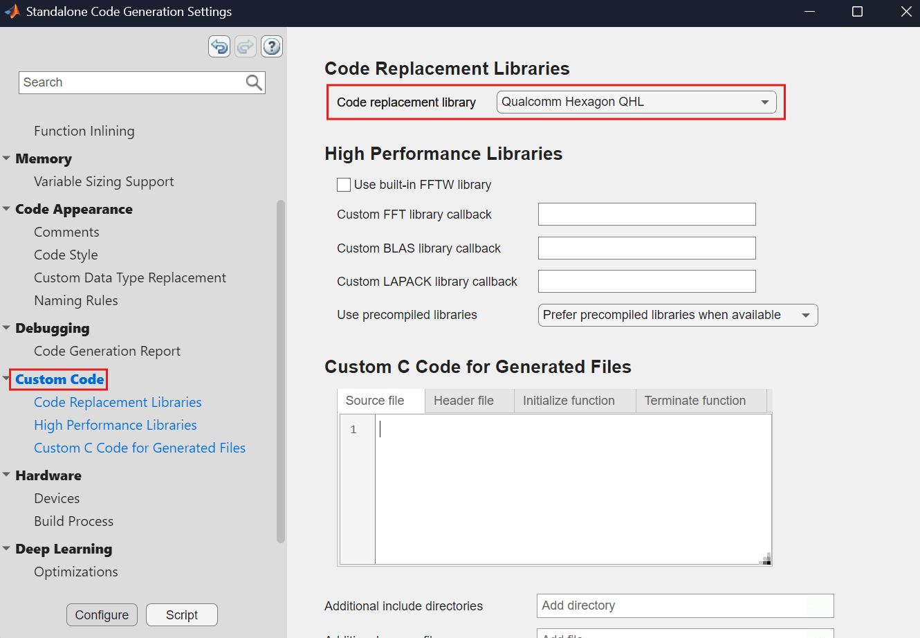 Set Custom Code > Code replacement library to Qualcomm Hexagon QHL**.**