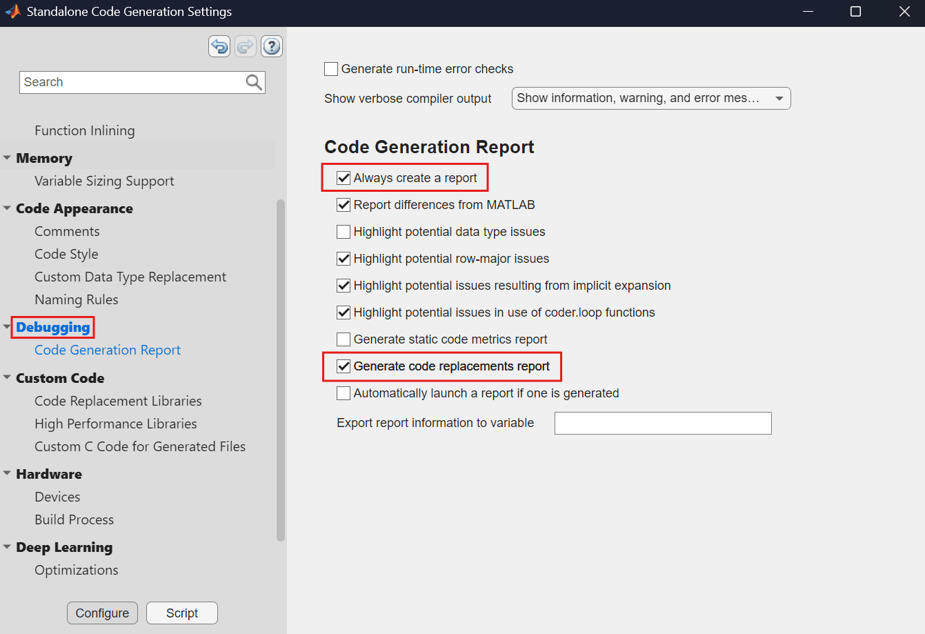 Check Debugging > Always create a report and Debugging > Generate code replacements report.