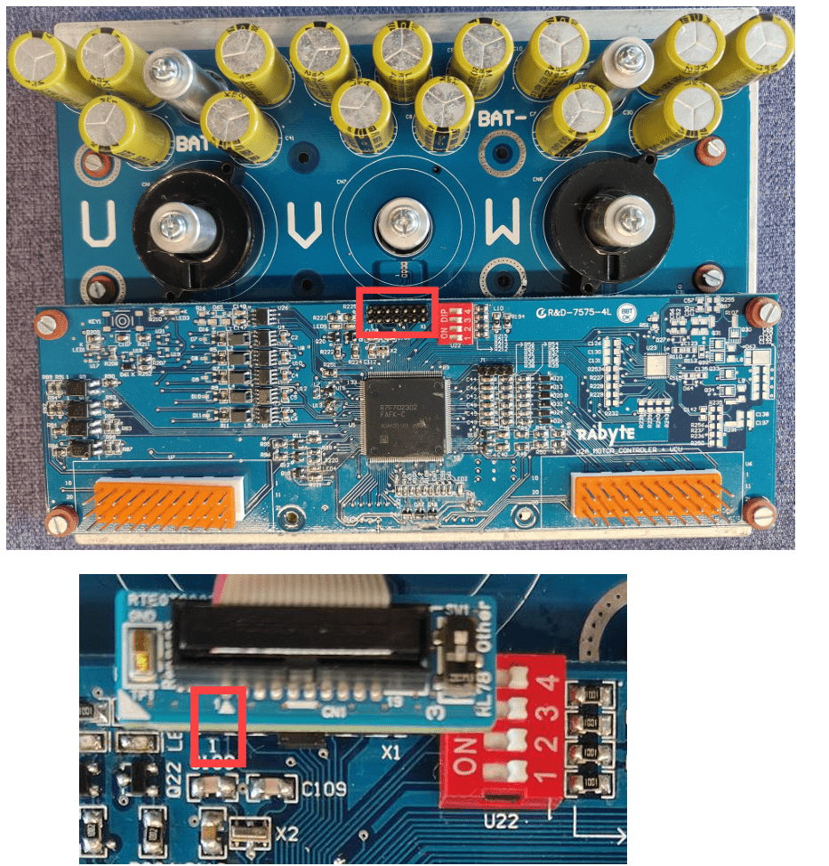 Connect the E2 Emulator to header X1 on the U2A Inverter board.
