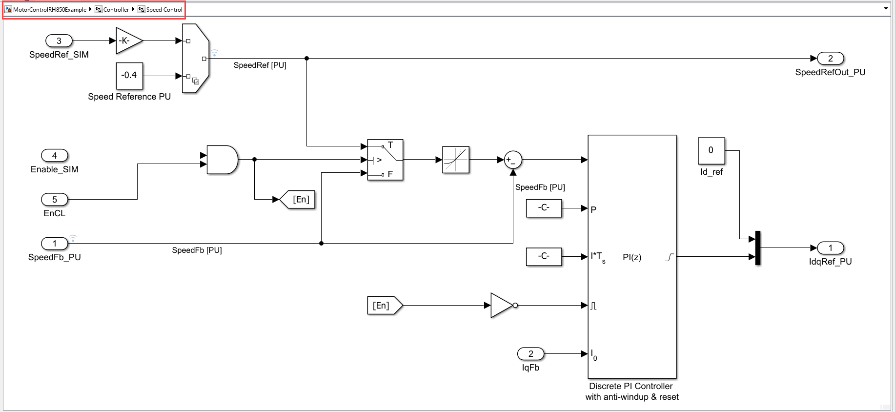 To view the speed control model, navigate to MotorControlRH850Example > Controller > SpeedControl model.