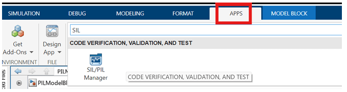 renesas_pmsm_foc_sim.slxmodel, click Apps and then select SIL/PIL Manager.
