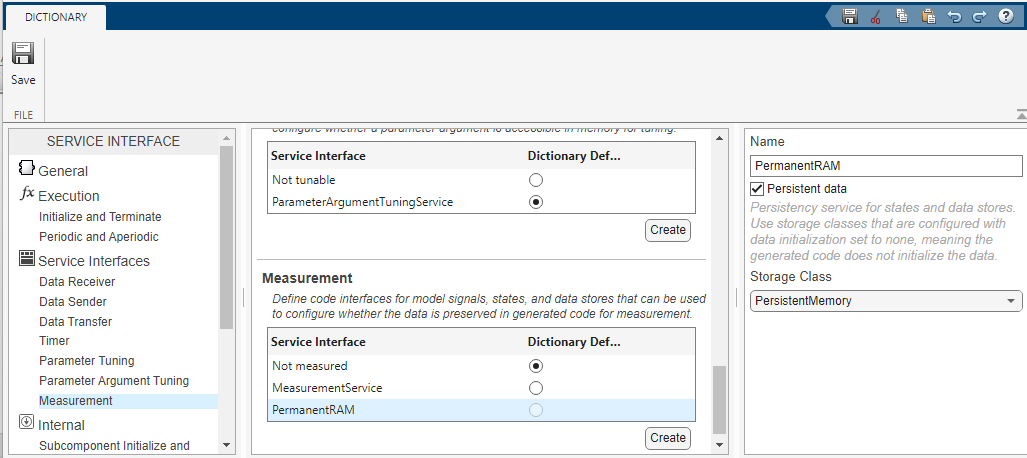 To configure a measurement service interface used with nonvolatile memory, the service configuration must enable the persistent data option and specify a storage class that does not initialize the data. Measurement service interfaces and storage classes are defined in a shared Embedded Coder Dictionary. Use the Code Mappings editor to configure the measurement service interface for specific states and data stores.