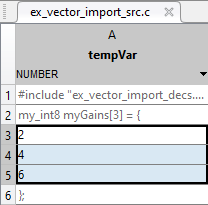 Suppose your external code defines a vector parameter myGains with three elements. Save the definition in your current folder in a file ex_vector_import_src.c.