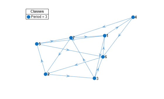 mc = dtmc(P);Plot a directed graph of the Markov chain and identify classes using node colors and markers.