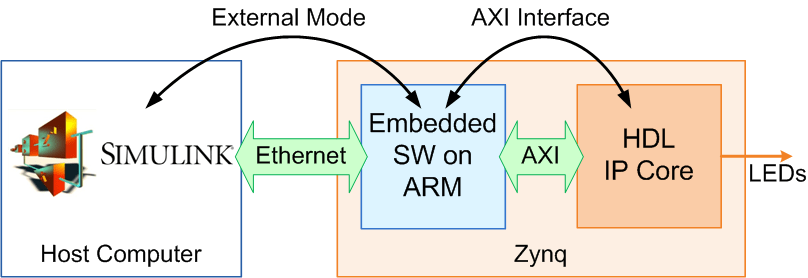 The Simulink model tunes and monitors the algorithm running on the hardware. Because the ARM processor is connected to the HDL IP core through the AXI interface, you can use external mode to tune parameters, and capture data from the FPGA.