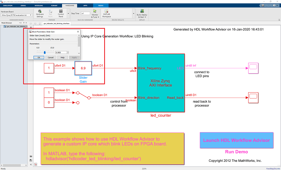 This example is a step-by-step guide that helps you use HDL Coder™ to generate a custom HDL IP core which blinks LEDs on the Xilinx Zynq ZC702 evaluation kit, and shows how to use Embedded Coder® to generate C code that runs on the ARM® processor to control the LED blink frequency.