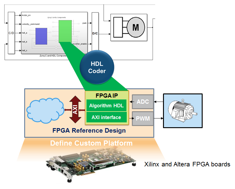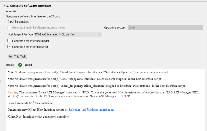 You can optionally build your own custom reference designs and integrate the generated IP core into the reference design. The workflow does not require the Embedded Coder® software, because you need not generate the embedded code that is run on the processor. This means that the workflow does not have a Generate Software Interface Model task.