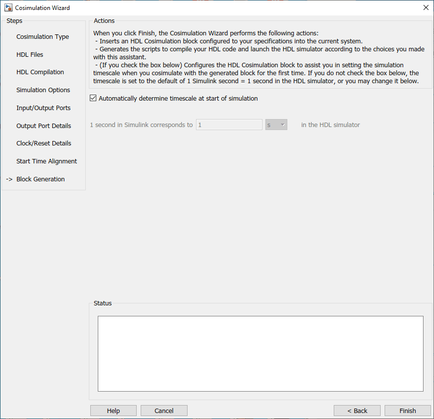 Before you generate the HDL Cosimulation block, you have the option to determine the timescale before you finish the Cosimulation Wizard. Alternately, you can instruct HDL Verifier to calculate a timescale later. Timescale calculation by the verification software occurs after you connect all the input/output ports of the generated HDL Cosimulation block and start simulation.