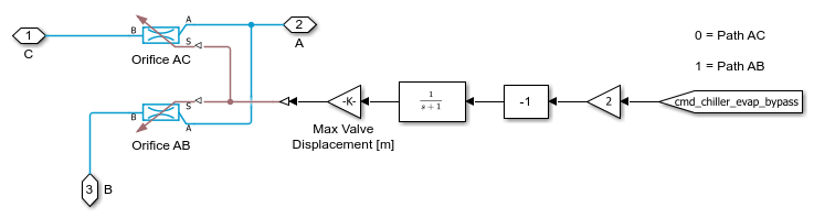 Two orifices operating in the opposite manner model the 3-way valve. In cold loop mode, the valve directs refrigerant to the chiller and expansion valve to cool the batteries and cabin. In heat pump mode, the valve normally directs the refrigerant to bypass the chiller and evaporator and return to the compressor. However, if the coolant is sufficiently warm, the valve directs the refrigerant back to the chiller to recover some heat from the coolant before returning to the compressor. This rerouting improves the heat pump mode cycle efficiency by reducing the pressure difference that the compressor needs to maintain.
