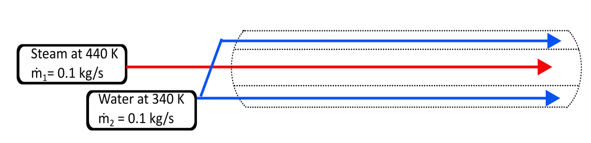 The type of fluid in the heat exchanger also impacts the heat transfer rate and final temperatures. Consider the previous parallel flow concentric cylinder heat exchanger, but instead of hot water, steam at 440 K flows through the inner cylinder and water at 340 K flows in the outer cylinder. Ignore any effects of fluid phase changes and assume that the steam behaves as a perfect gas. Calculate the heat transfer rate and exit temperatures for this heat exchanger.