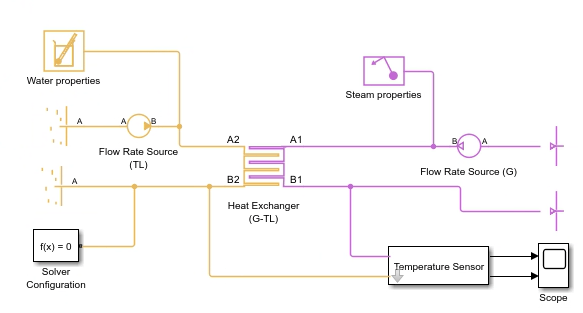 mdl = 'SimpleHeatExchangerParameterizationAndPerformanceTLTL'; open_system(mdl); set_param('SimpleHeatExchangerParameterizationAndPerformanceTLTL/Heat Exchanger (TL-TL)','hex_type','fluids.heat_exchangers.enum.FlowArrangement.ShellTube') set_param('SimpleHeatExchangerParameterizationAndPerformanceTLTL/Heat Exchanger (TL-TL)','shell_num','NumPass') set_param('SimpleHeatExchangerParameterizationAndPerformanceTLTL/Heat Exchanger (TL-TL)','heat_transfer_area_1','S_tubes') set_param('SimpleHeatExchangerParameterizationAndPerformanceTLTL/Heat Exchanger (TL-TL)','heat_transfer_area_2','S_tubes') set_param('SimpleHeatExchangerParameterizationAndPerformanceTLTL/Heat Exchanger (TL-TL)','liquid_volume_2','V_tubes') set_param('SimpleHeatExchangerParameterizationAndPerformanceTLTL/Heat Exchanger (TL-TL)','liquid_volume_1','V_shell') out = sim(mdl);