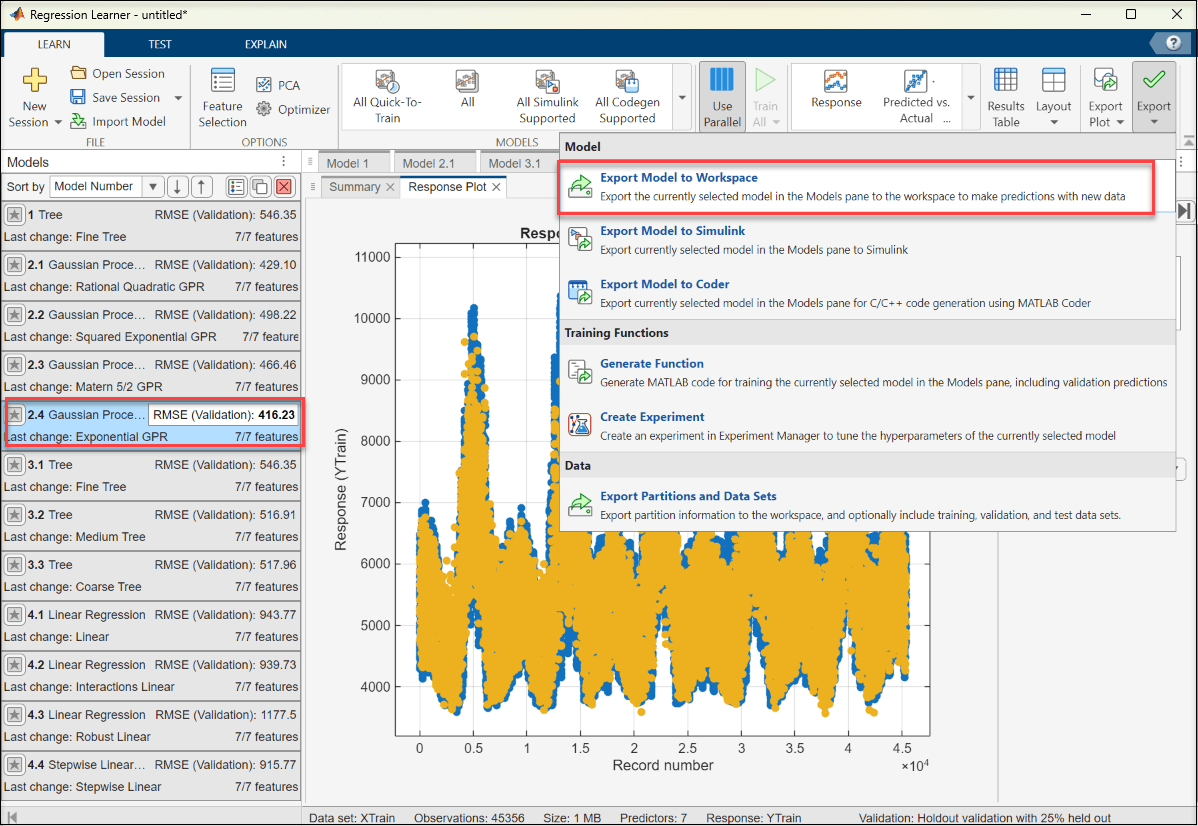 4. After the training is complete, select the model with the least RMSE and export it to the workspace. For the data set used in this example the Exponential GPR model has the least RMSE.