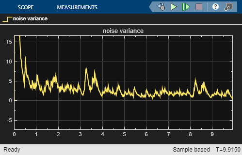 The first plot (left) compares the measured output (blue) against the values predicted by the time varying Kalman filter (yellow). The second plot (right) shows the output error variance as estimated by the ARMAX estimator block. The computation is performed using the Moving Variance block from DSP System Toolbox™.