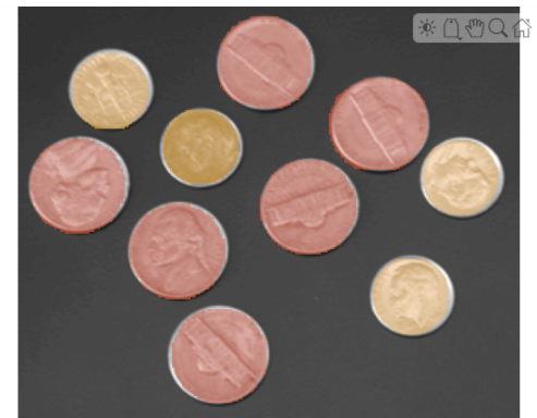 Draw a mask that contains all the nickels in the image using the default overlay value of 1. To finish drawing, press Enter or click the Accept icon to create the mask.