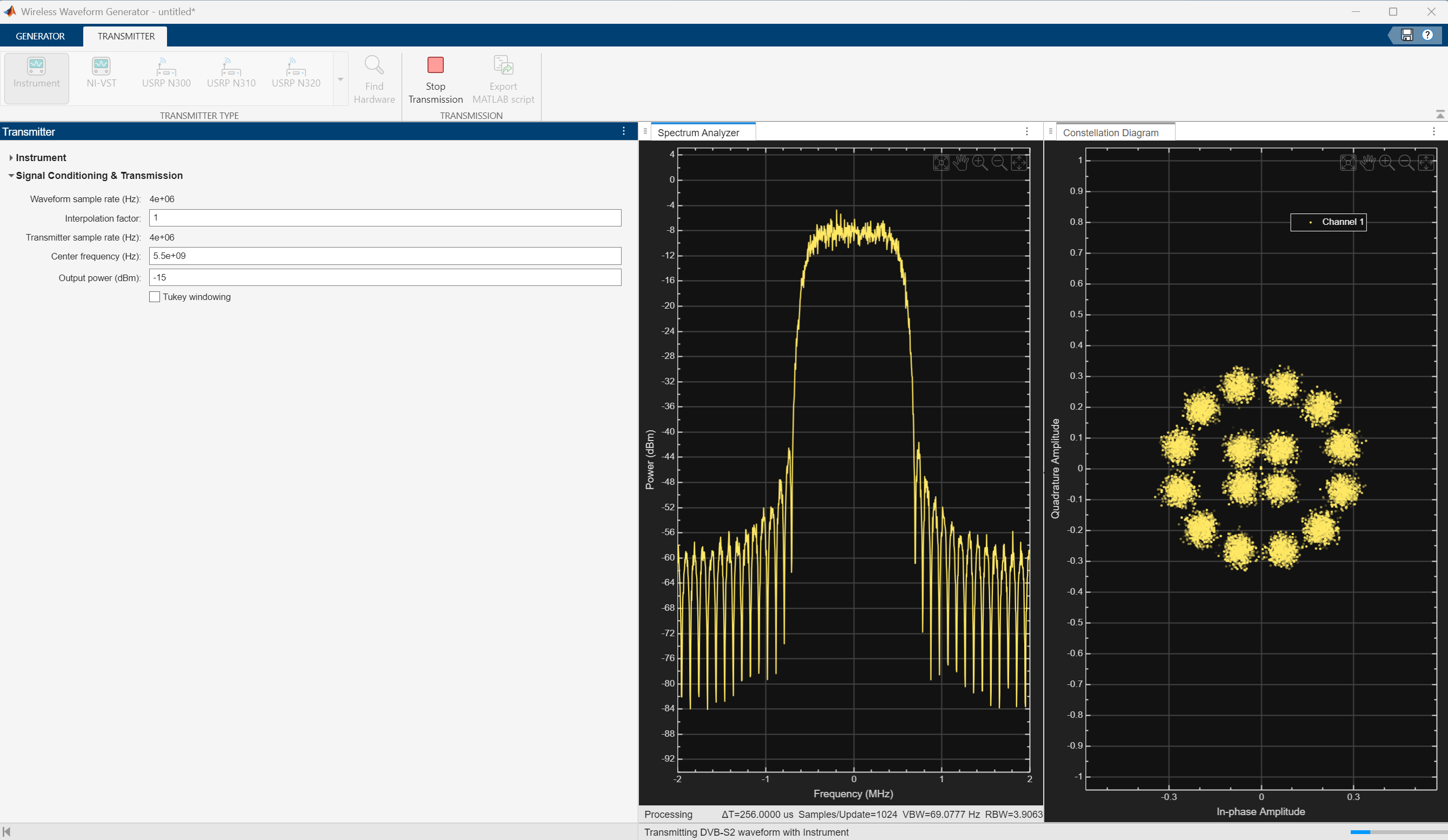 DVB-S2 Waveform Transmission and Reception Using Instrument Control Toolbox