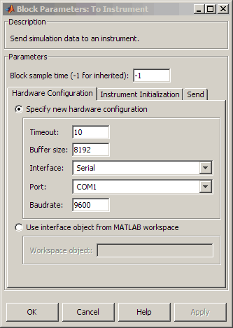 Select the type of hardware interface to the instrument. Your options are those interfaces supported by the Instrument Control Toolbox™ software. The previous figure shows a configuration for a serial port interface.