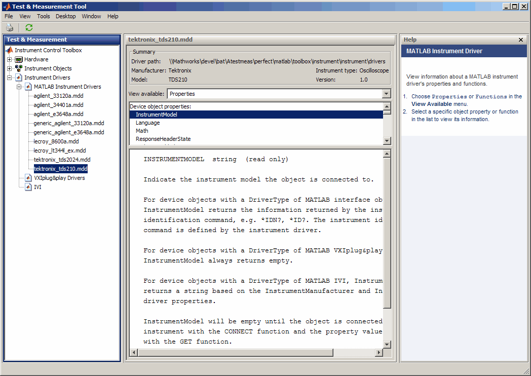 When the Test & Measurement Tool scans for drivers, it makes them available as nodes under the driver type node. Expand the MATLAB software Instrument Drivers node to reveal the installed drivers. Select one of them to see the driver's details.