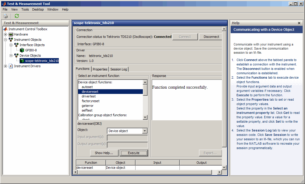 In the following figure, the Test & Measurement Tool resets a TDS 210 oscilloscope by issuing a call to the devicereset function of the instrument driver. Communicating this way, you don't need to know what the actual oscilloscope reset command is.