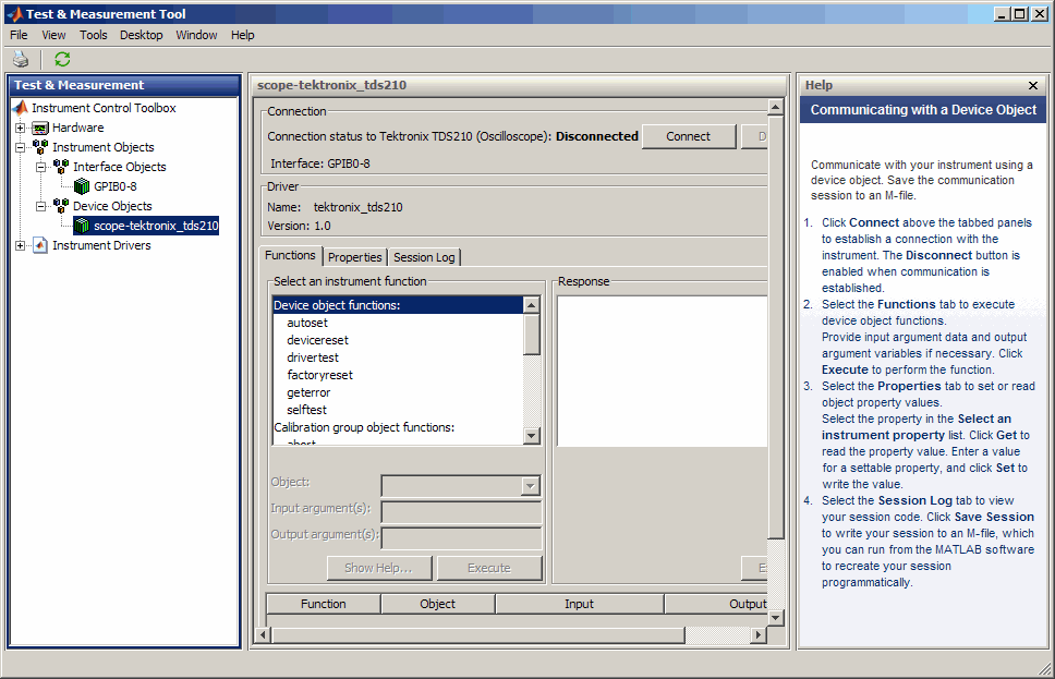 Whether the instrument objects are created automatically, created through the New Object Creation dialog box, or created on the MATLAB Command window, the Test & Measurement Tool enables you to set the properties of these objects. To change object properties in the Test & Measurement Tool: