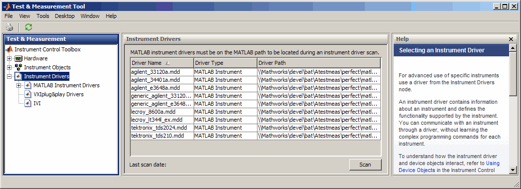 Select the MATLAB Instrument Drivers node in the tree. Then click Scan to get an updated display of all the installed MATLAB instrument drivers found on the MATLAB software path.