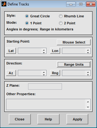 The Mode selection buttons are used to specify whether one point or two points are to be used in defining the track. If one-point mode is selected, a starting point, azimuth, and range are the required inputs. If two-point mode is selected, starting and ending points are required.