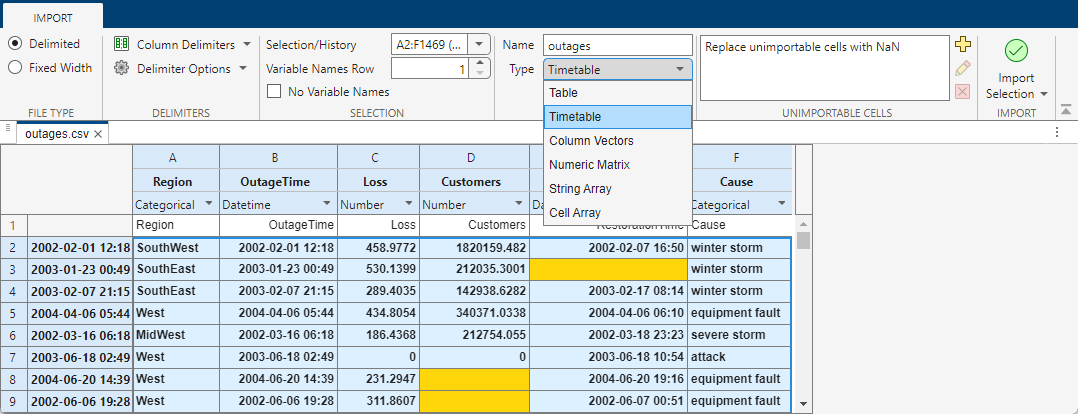 2. Click Import Selection (near the upper-right corner). The new timetable, named outages, appears in your workspace.
