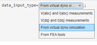 • From virtual dyno simulation: This option uses the FEA based virtual dyno simulation. Select this option if you do not have pre-existing data to import. This script loads data from the pmsmData_LdLq.mat and DynoData.mat data files that are provided with this example.