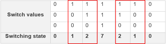 The controller operates the inverter in a complementary mode. The pulse that controls the lower transistor in an inverter leg is always opposite to the one controlling the upper transistor. Therefore, the upper-transistors of a three-phase inverter can have eight switching states (for space vector modulation PWM) described in the following table.