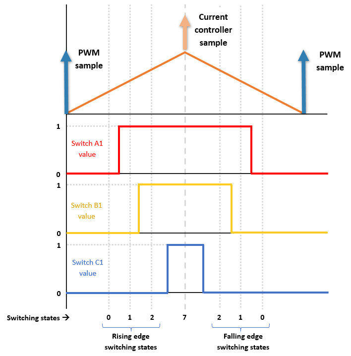 In the preceding example of PWM cycle, the three inverter leg switches show the following states.