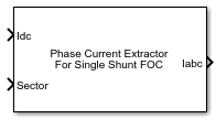 The Phase Current Extractor for Single Shunt FOC block transforms the DC shunt currents, measured at the rising or falling edges of each phase's PWM pulses, into phase currents for the Single-Shunt Field Oriented Control (FOC) algorithm.