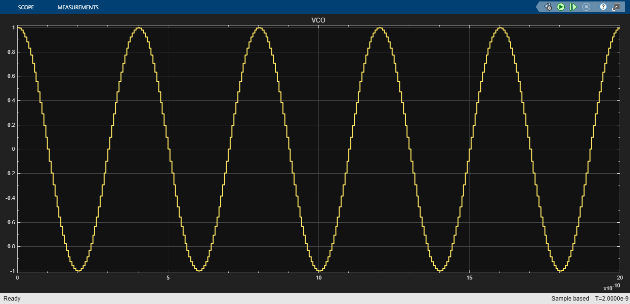 /2 in the sinusoidal output. For a 1 Volt of control voltage we expect the VCO to be generating a sinusoidal output of 2.5GHz frequency. Accordingly, the sample time has been set as 1/(64*2.5e9) producing 64 points in one cycle of sine wave output